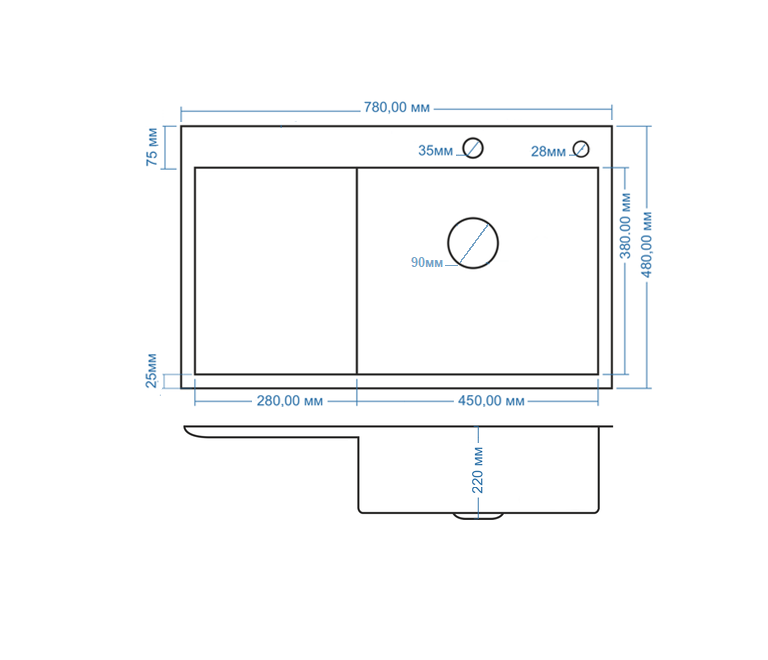 Мойка 78х48х23 крыло справа SATIN.толщина 3мм. Дозатор, коландер, сифон в комплекте ТМР
