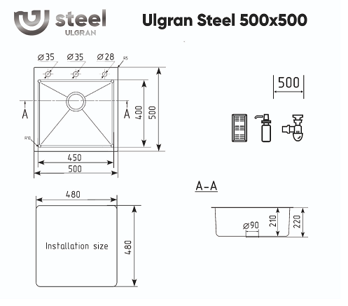 Мойка Steel нерж сталь 500*500, брашированная сталь Ulgran